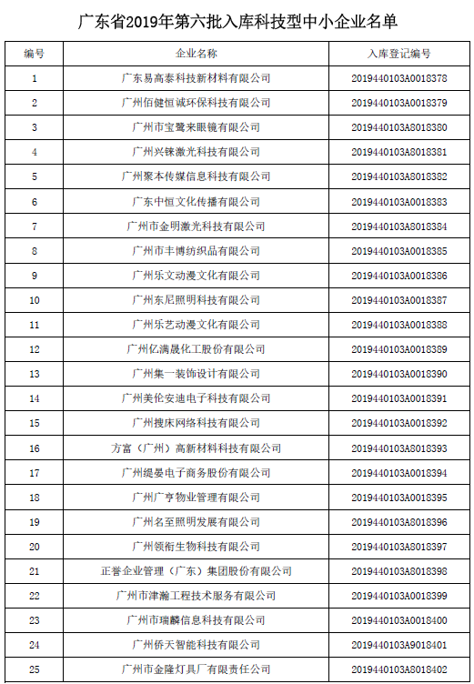 廣東省科學技術廳關于2019年第六批入庫科技型中小企業的公告