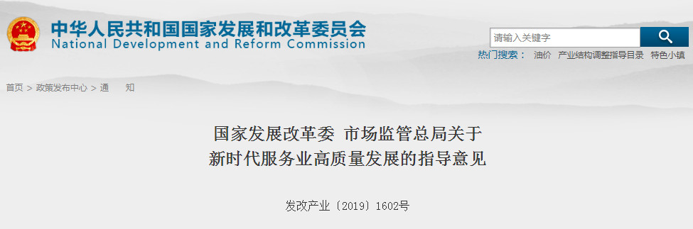為深入貫徹黨的十九大精神,落實(shí)《中共中央、國務(wù)院關(guān)于推動(dòng)高質(zhì)量發(fā)展的意見》要求,促進(jìn)我國服務(wù)業(yè)高質(zhì)量發(fā)展,國家發(fā)展改革委、市場監(jiān)管總局制定《關(guān)于新時(shí)代服務(wù)業(yè)高質(zhì)量發(fā)展的指導(dǎo)意見》。指導(dǎo)意見突出宏觀統(tǒng)籌,圍繞制約服務(wù)業(yè)高質(zhì)量發(fā)展的薄弱環(huán)節(jié)和共性問題部署任務(wù),分行業(yè)高質(zhì)量發(fā)展由行業(yè)主管部門部署實(shí)施。