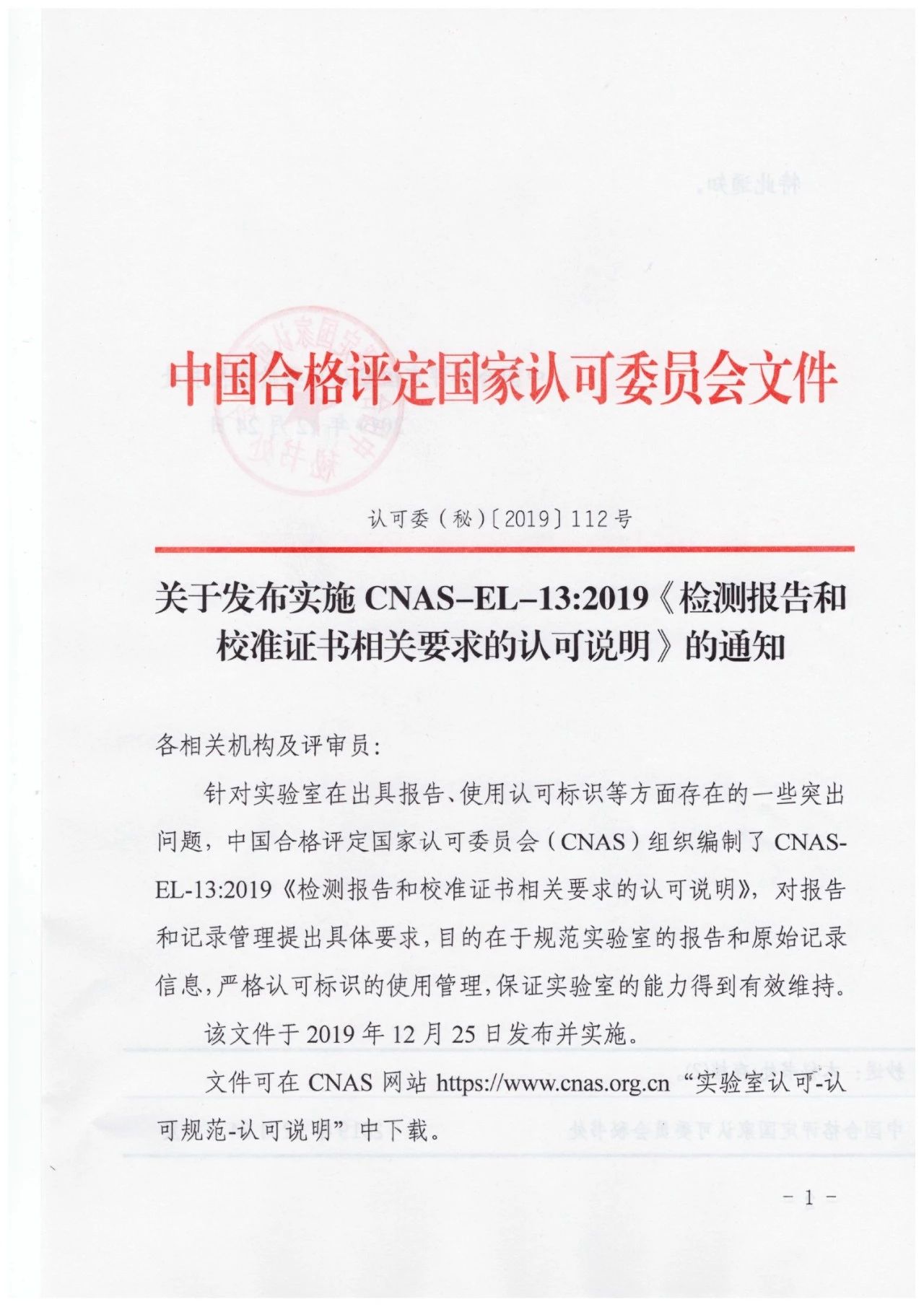 關(guān)于發(fā)布實施CNAS-EL-13:2019《檢測報告和校準(zhǔn)證書相關(guān)要求的認(rèn)可說明》的通知