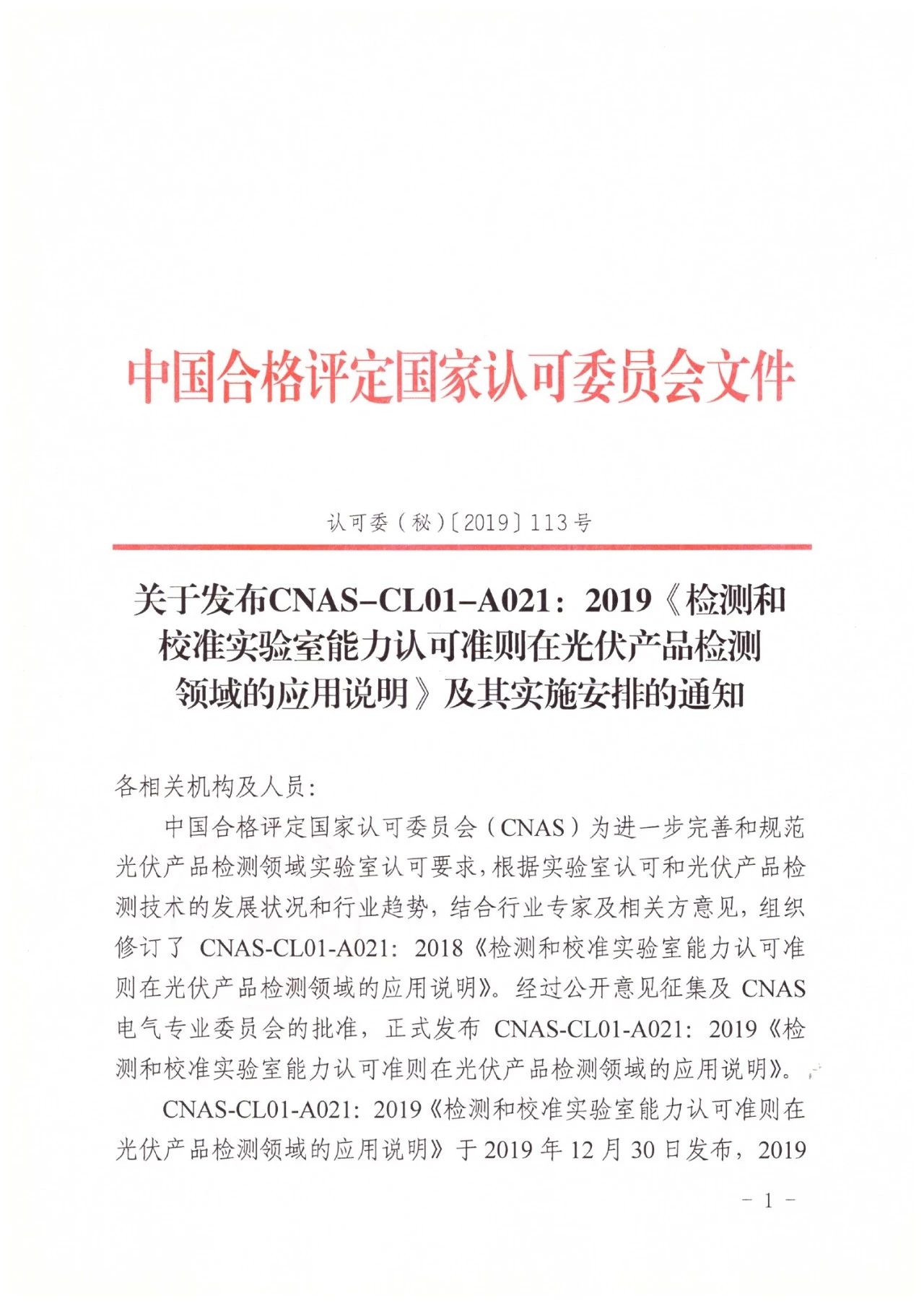 關(guān)于發(fā)布CNAS-CL01-A021:2019《檢測和校準(zhǔn)實驗室能力認(rèn)可準(zhǔn)則在光伏產(chǎn)品檢測領(lǐng)域的應(yīng)用說明》及其實施安排的通知