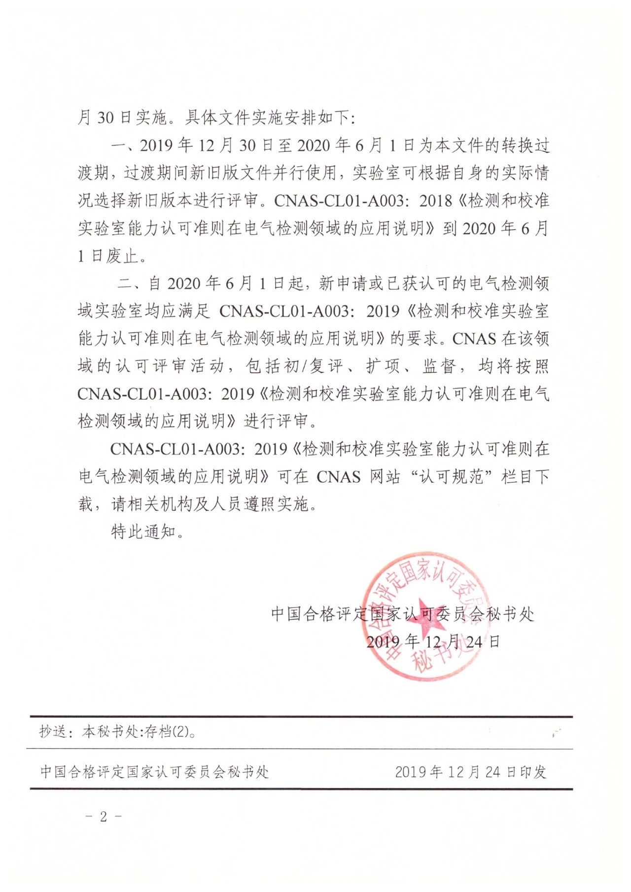 關(guān)于發(fā)布CNAS-CL01-A003:2019《檢測和校準(zhǔn)實驗室能力認(rèn)可準(zhǔn)則在電氣檢測領(lǐng)域的應(yīng)用說明》及其實施安排的通知
