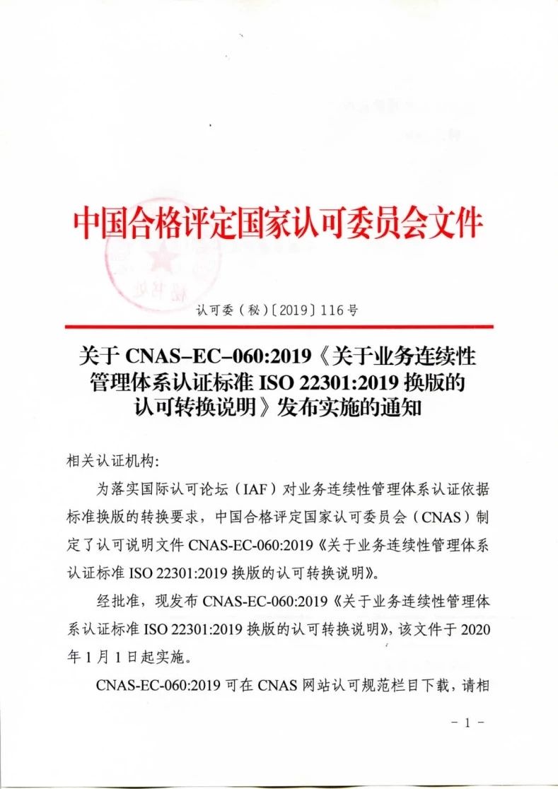 關(guān)于CNAS-EC-060:2019《關(guān)于業(yè)務(wù)連續(xù)性管理體系認(rèn)證標(biāo)準(zhǔn)ISO22301:2019換版的認(rèn)可轉(zhuǎn)換說明》發(fā)布實施的通知