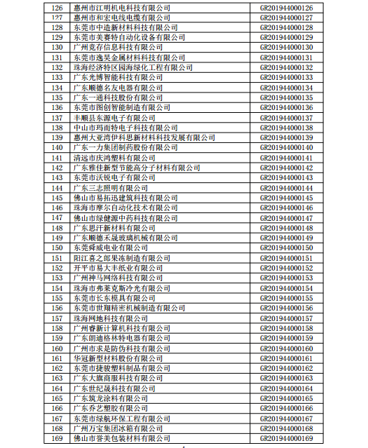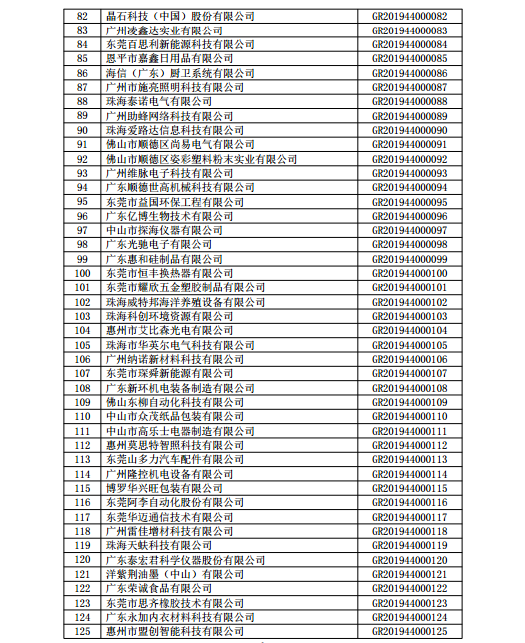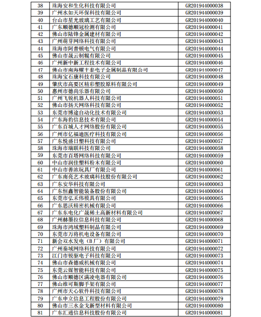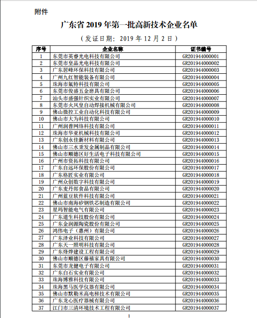 你們上報(bào)的《關(guān)于廣東省2019年高新技術(shù)企業(yè)認(rèn)定備案的函》(粵科函高字〔2019〕1730號(hào))收悉。現(xiàn)將公示無(wú)異議的東莞市英睿光電科技有限公司等3202家企業(yè)予以高新技術(shù)企業(yè)備案。請(qǐng)你們按照《廣東省2019年第一批高新技術(shù)企業(yè)名單》(詳見附件)中的企業(yè)名稱、高新技術(shù)企業(yè)證書編號(hào)和發(fā)證日期打印并頒發(fā)“高新技術(shù)企業(yè)證書”。